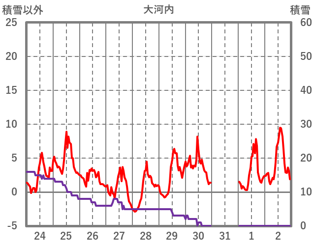 | 日 | 時 | 気温 | 降水 | 風向/風速 | 日照 | 積雪 | 降雪 |