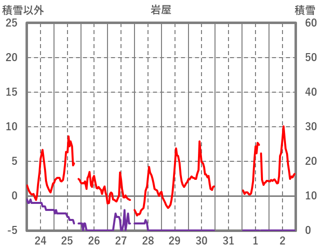 | 日 | 時 | 気温 | 降水 | 風向/風速 | 日照 | 積雪 | 降雪 |