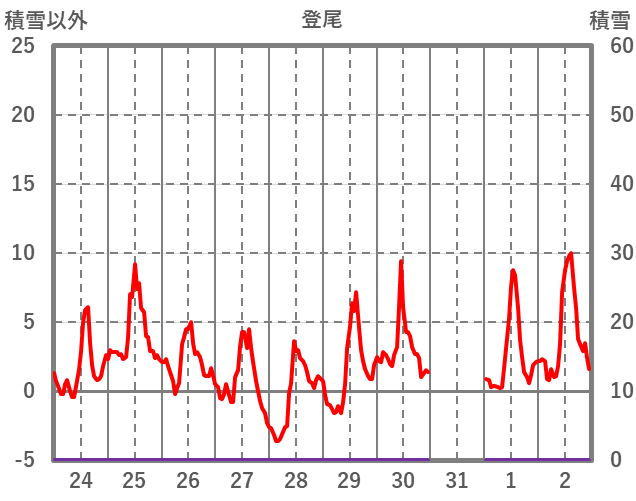 | 日 | 時 | 気温 | 降水 | 風向/風速 | 日照 | 積雪 | 降雪 |