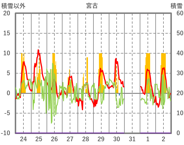 | 日 | 時 | 気温 | 降水 | 風向/風速 | 日照 | 積雪 | 降雪 |