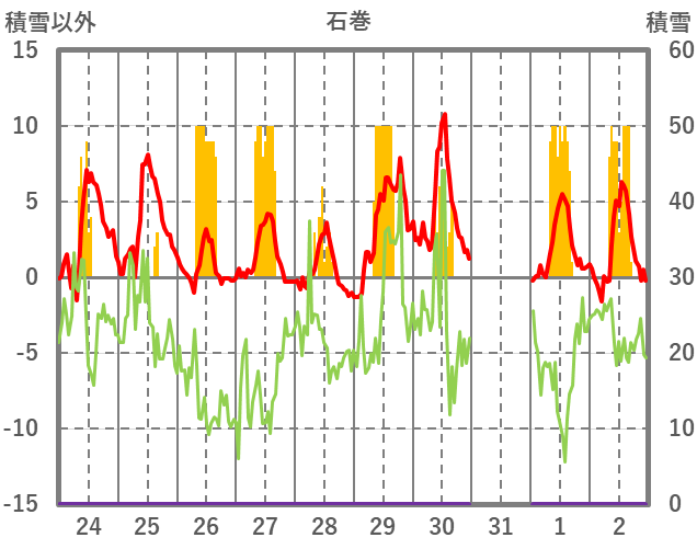 | 日 | 時 | 気温 | 降水 | 風向/風速 | 日照 | 積雪 | 降雪 |