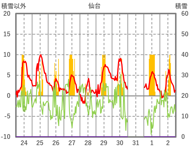 | 日 | 時 | 気温 | 降水 | 風向/風速 | 日照 | 積雪 | 降雪 |