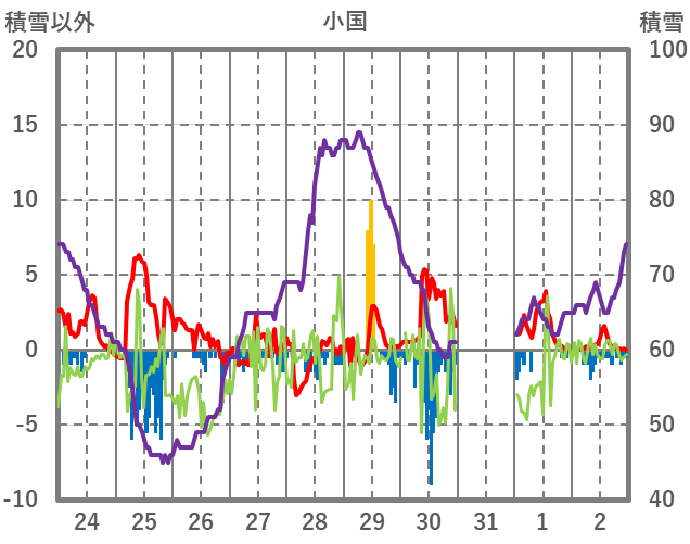 | 日 | 時 | 気温 | 降水 | 風向/風速 | 日照 | 積雪 | 降雪 |