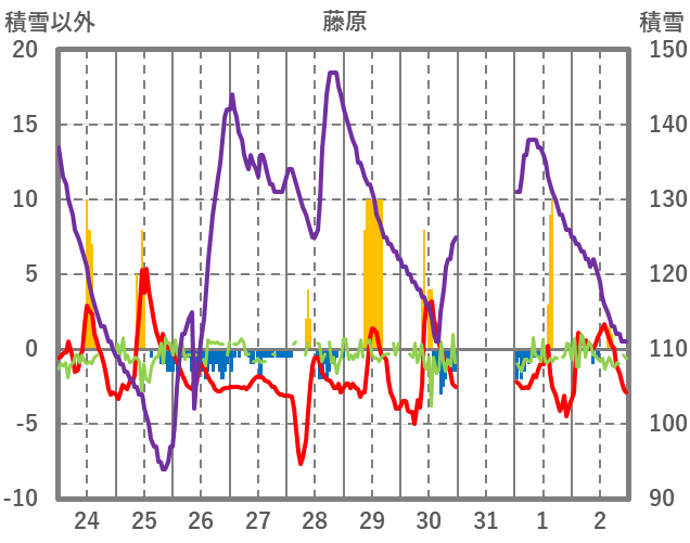 | 日 | 時 | 気温 | 降水 | 風向/風速 | 日照 | 積雪 | 降雪 |