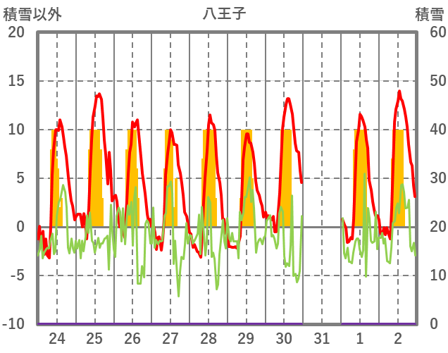 | 日 | 時 | 気温 | 降水 | 風向/風速 | 日照 | 積雪 | 降雪 |
