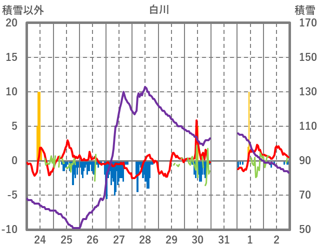 | 日 | 時 | 気温 | 降水 | 風向/風速 | 日照 | 積雪 | 降雪 |