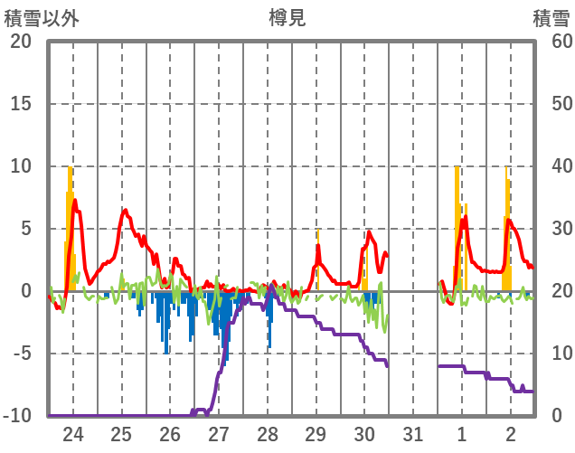 | 日 | 時 | 気温 | 降水 | 風向/風速 | 日照 | 積雪 | 降雪 |