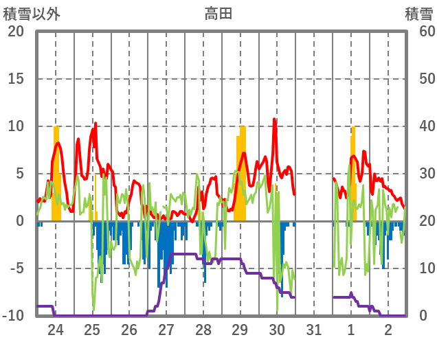 | 日 | 時 | 気温 | 降水 | 風向/風速 | 日照 | 積雪 | 降雪 |