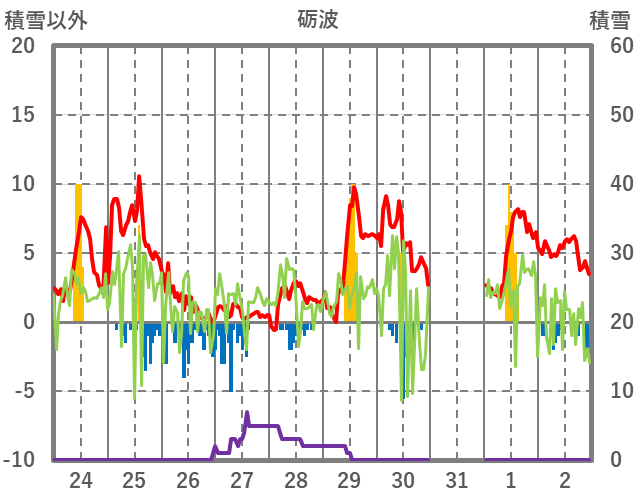 | 日 | 時 | 気温 | 降水 | 風向/風速 | 日照 | 積雪 | 降雪 |