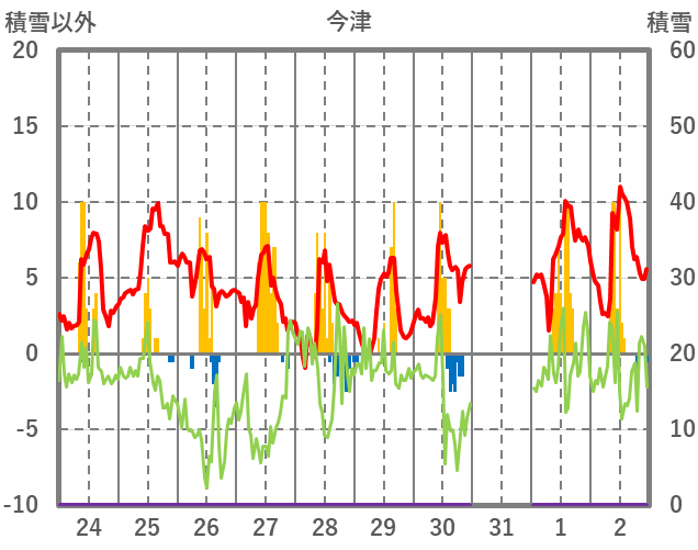 | 日 | 時 | 気温 | 降水 | 風向/風速 | 日照 | 積雪 | 降雪 |