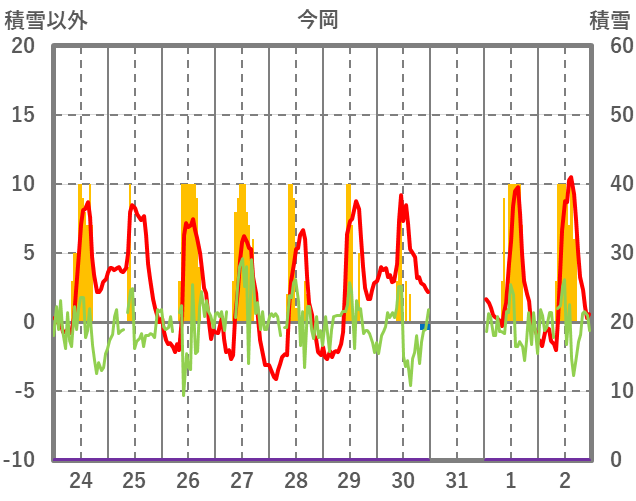| 日 | 時 | 気温 | 降水 | 風向/風速 | 日照 | 積雪 | 降雪 |