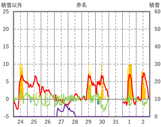 | 日 | 時 | 気温 | 降水 | 風向/風速 | 日照 | 積雪 | 降雪 |