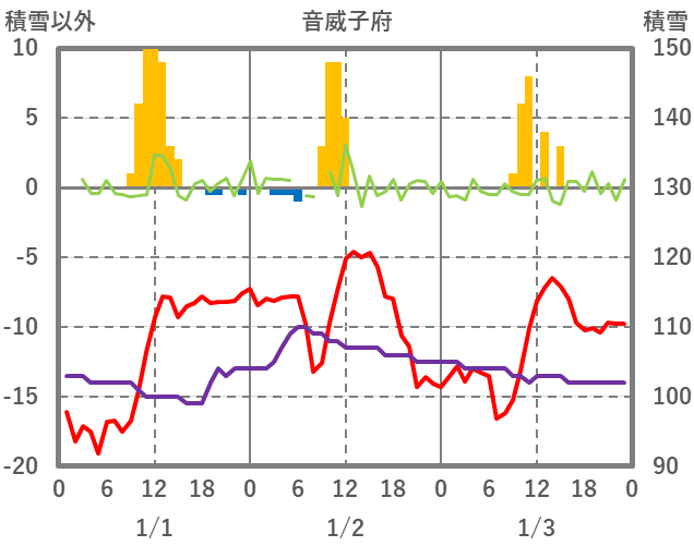 | 日 | 時 | 気温 | 降水 | 風向/風速 | 日照 | 積雪 | 降雪 |