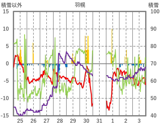 | 日 | 時 | 気温 | 降水 | 風向/風速 | 日照 | 積雪 | 降雪 |