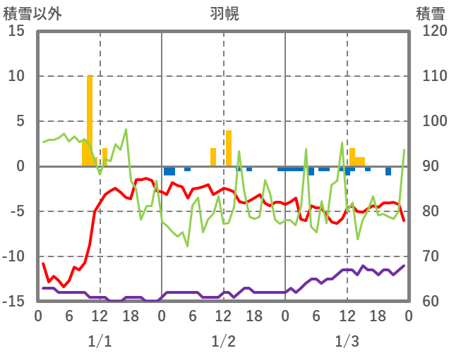 | 日 | 時 | 気温 | 降水 | 風向/風速 | 日照 | 積雪 | 降雪 |