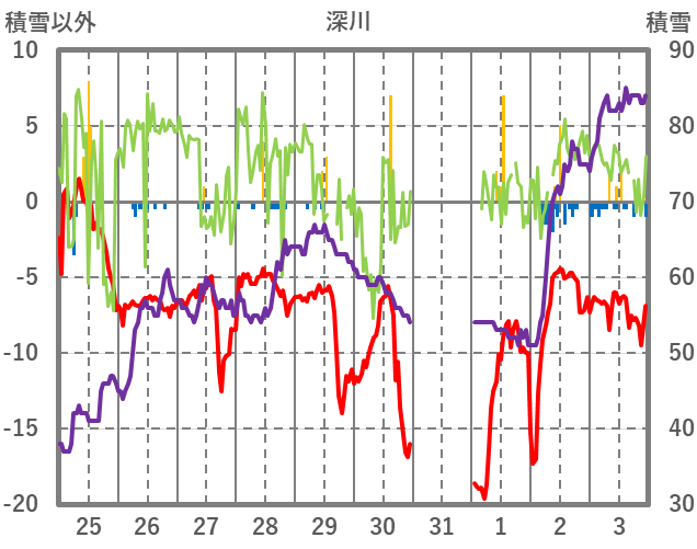 | 日 | 時 | 気温 | 降水 | 風向/風速 | 日照 | 積雪 | 降雪 |