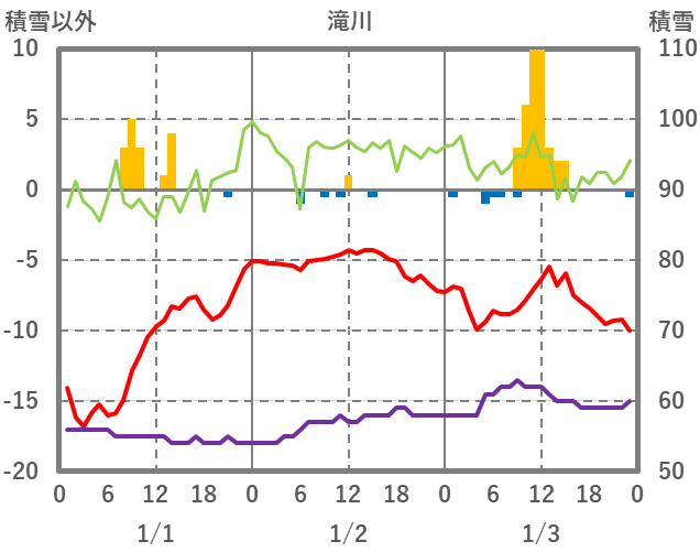 | 日 | 時 | 気温 | 降水 | 風向/風速 | 日照 | 積雪 | 降雪 |