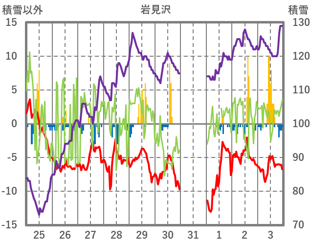 | 日 | 時 | 気温 | 降水 | 風向/風速 | 日照 | 積雪 | 降雪 |