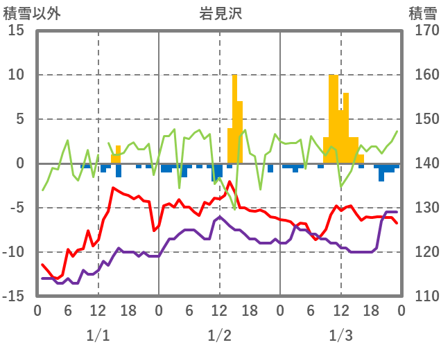 | 日 | 時 | 気温 | 降水 | 風向/風速 | 日照 | 積雪 | 降雪 |