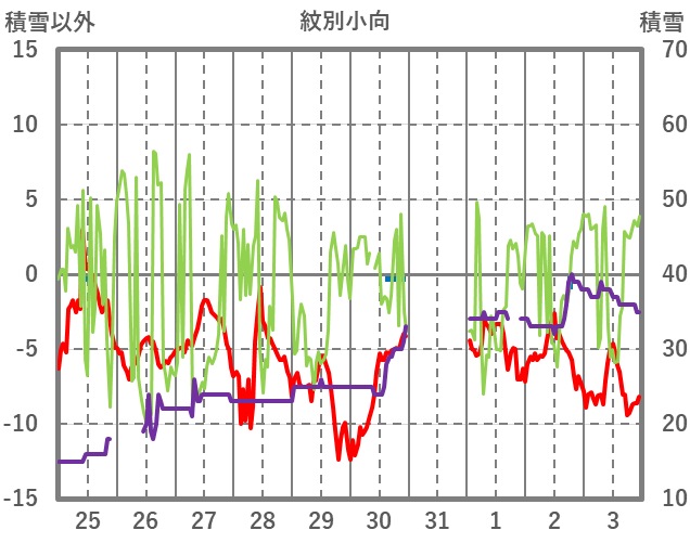 | 日 | 時 | 気温 | 降水 | 風向/風速 | 日照 | 積雪 | 降雪 |