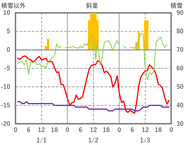 | 日 | 時 | 気温 | 降水 | 風向/風速 | 日照 | 積雪 | 降雪 |