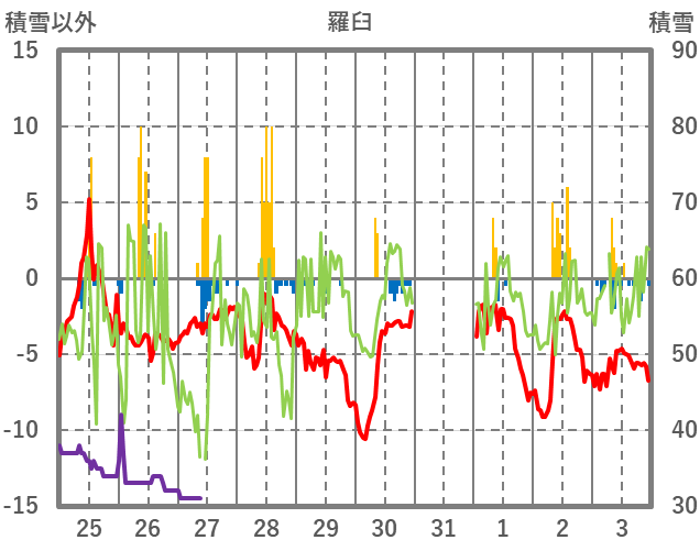 | 日 | 時 | 気温 | 降水 | 風向/風速 | 日照 | 積雪 | 降雪 |
