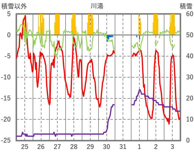| 日 | 時 | 気温 | 降水 | 風向/風速 | 日照 | 積雪 | 降雪 |