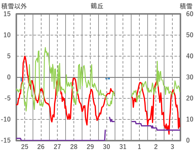 | 日 | 時 | 気温 | 降水 | 風向/風速 | 日照 | 積雪 | 降雪 |
