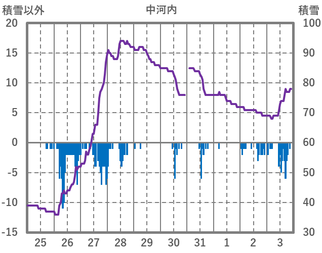 | 日 | 時 | 気温 | 降水 | 風向/風速 | 日照 | 積雪 | 降雪 |