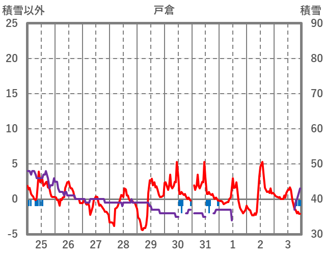 | 日 | 時 | 気温 | 降水 | 風向/風速 | 日照 | 積雪 | 降雪 |
