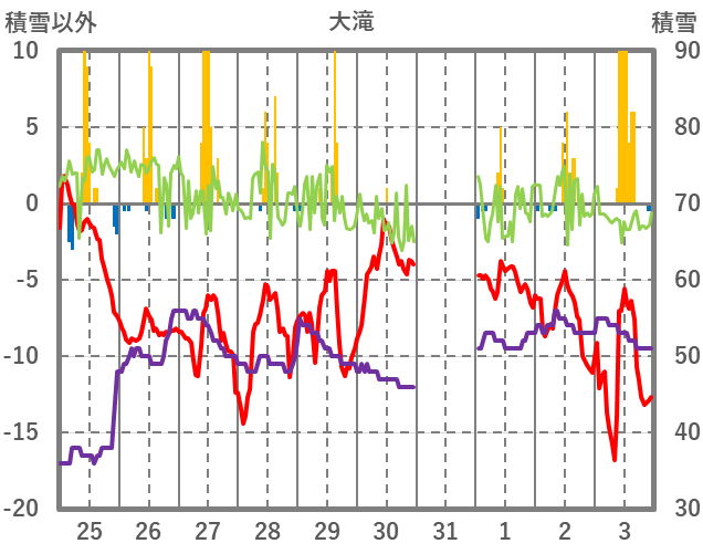 | 日 | 時 | 気温 | 降水 | 風向/風速 | 日照 | 積雪 | 降雪 |