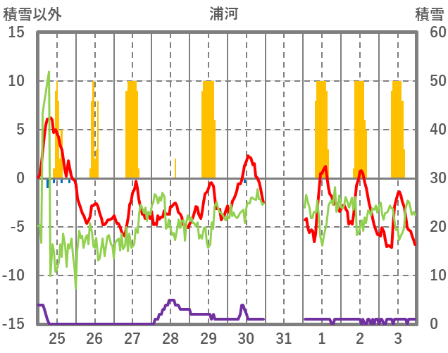 | 日 | 時 | 気温 | 降水 | 風向/風速 | 日照 | 積雪 | 降雪 |