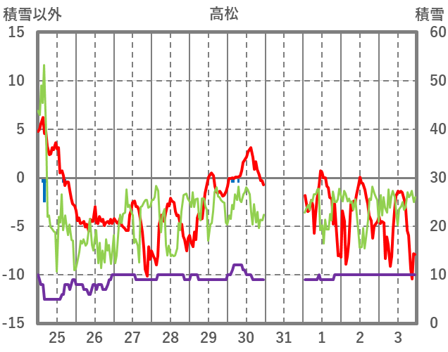 | 日 | 時 | 気温 | 降水 | 風向/風速 | 日照 | 積雪 | 降雪 |