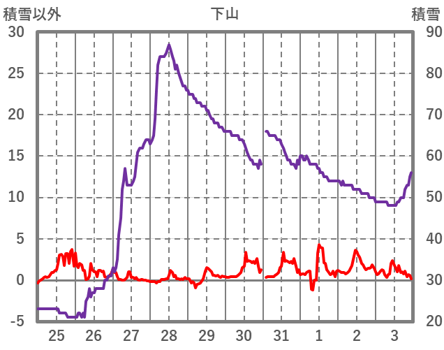 | 日 | 時 | 気温 | 降水 | 風向/風速 | 日照 | 積雪 | 降雪 |