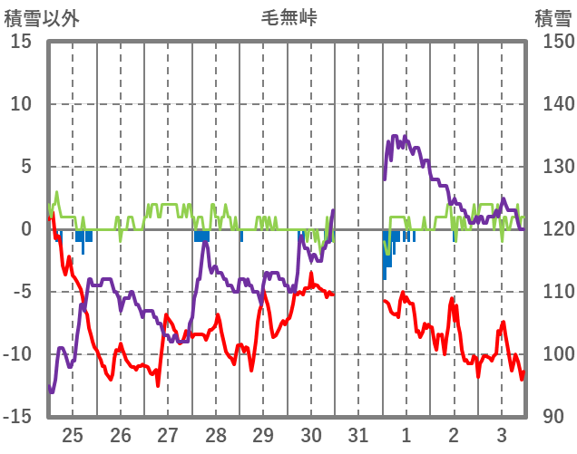 | 日 | 時 | 気温 | 降水 | 風向/風速 | 日照 | 積雪 | 降雪 |