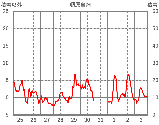 | 日 | 時 | 気温 | 降水 | 風向/風速 | 日照 | 積雪 | 降雪 |