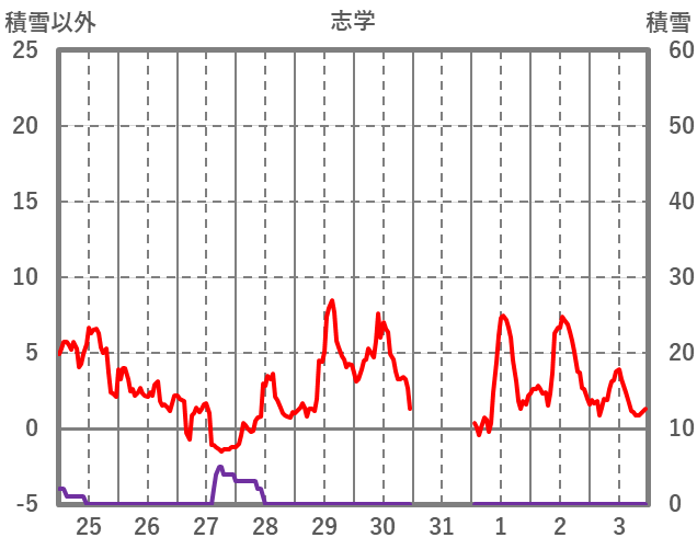| 日 | 時 | 気温 | 降水 | 風向/風速 | 日照 | 積雪 | 降雪 |