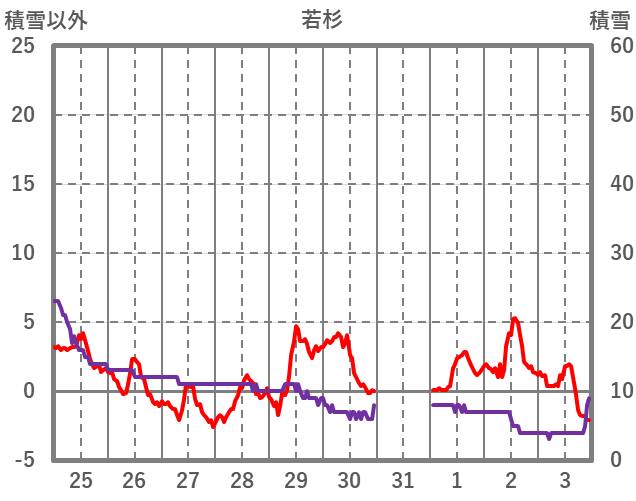 | 日 | 時 | 気温 | 降水 | 風向/風速 | 日照 | 積雪 | 降雪 |