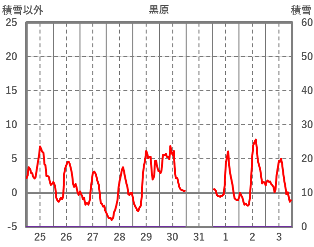 | 日 | 時 | 気温 | 降水 | 風向/風速 | 日照 | 積雪 | 降雪 |