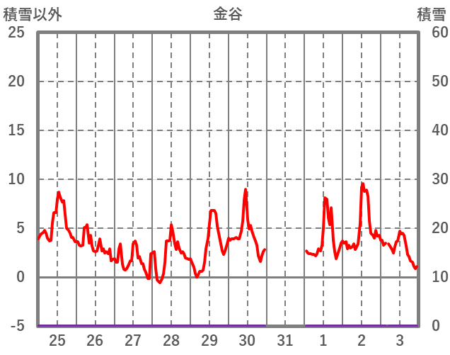 | 日 | 時 | 気温 | 降水 | 風向/風速 | 日照 | 積雪 | 降雪 |