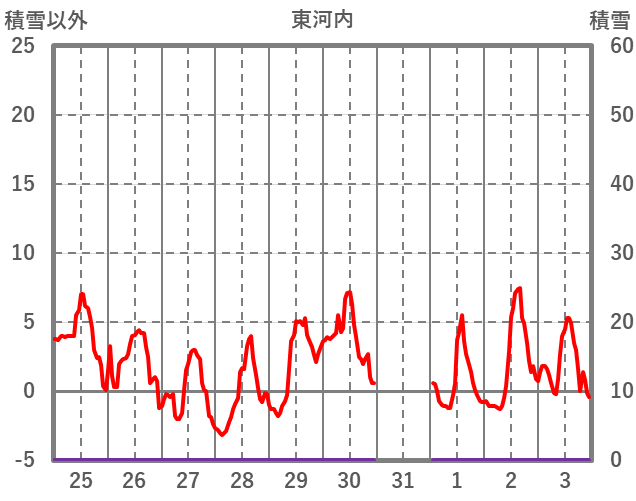 | 日 | 時 | 気温 | 降水 | 風向/風速 | 日照 | 積雪 | 降雪 |
