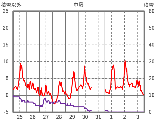 | 日 | 時 | 気温 | 降水 | 風向/風速 | 日照 | 積雪 | 降雪 |