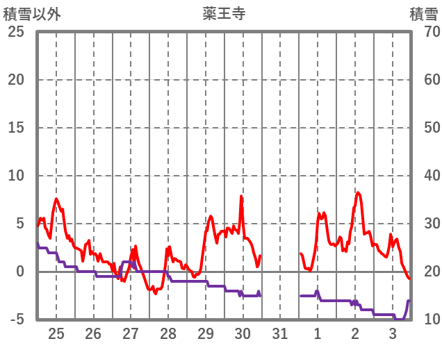 | 日 | 時 | 気温 | 降水 | 風向/風速 | 日照 | 積雪 | 降雪 |