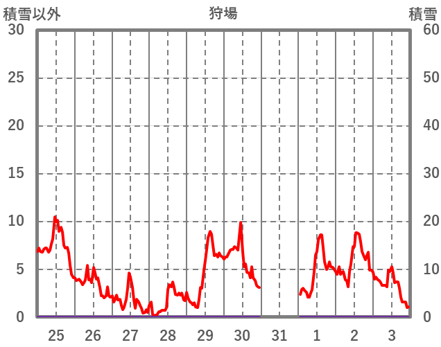 | 日 | 時 | 気温 | 降水 | 風向/風速 | 日照 | 積雪 | 降雪 |