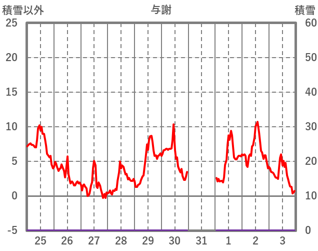 | 日 | 時 | 気温 | 降水 | 風向/風速 | 日照 | 積雪 | 降雪 |