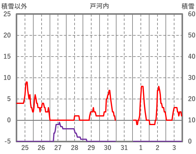 | 日 | 時 | 気温 | 降水 | 風向/風速 | 日照 | 積雪 | 降雪 |