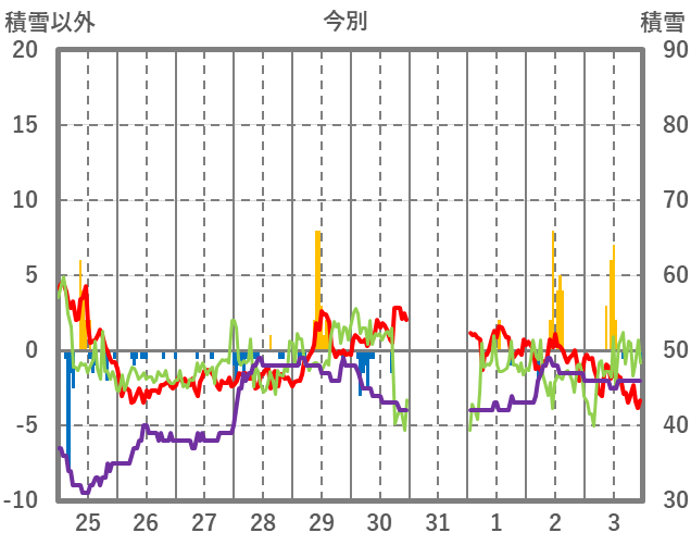 | 日 | 時 | 気温 | 降水 | 風向/風速 | 日照 | 積雪 | 降雪 |