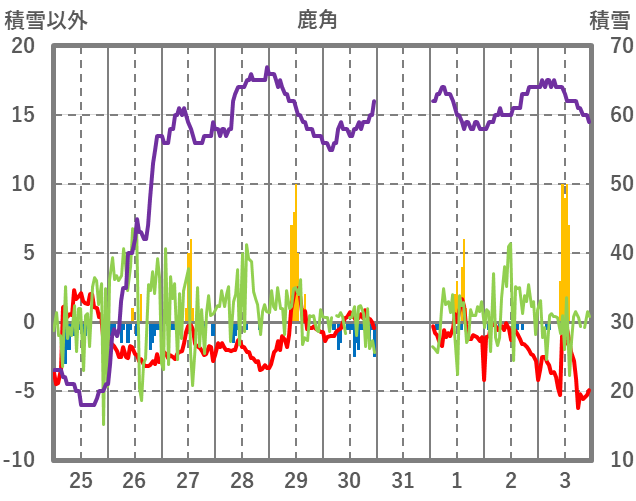 | 日 | 時 | 気温 | 降水 | 風向/風速 | 日照 | 積雪 | 降雪 |
