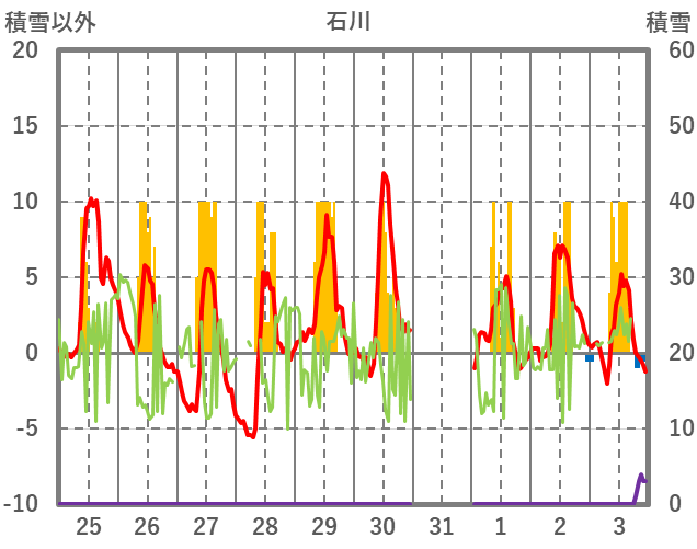 | 日 | 時 | 気温 | 降水 | 風向/風速 | 日照 | 積雪 | 降雪 |