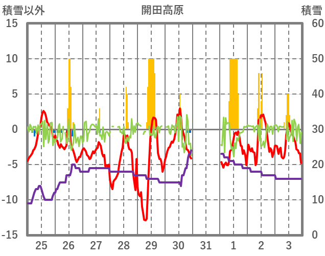 | 日 | 時 | 気温 | 降水 | 風向/風速 | 日照 | 積雪 | 降雪 |